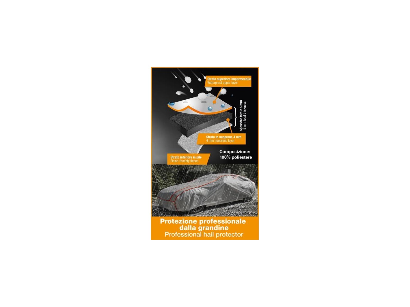 Copriauto antigrandine realizzato in materiale idrorepellente, con rivestimento interno in TNT a protezione della vernice ed imbottitura in neoprene da 4,5 mm nelle zone maggiormente esposte ai danni ovvero cofano/tetto/bagagliaio. Garantito contro grandine fino a 11 mm di diametro e con una velocità di caduta fino a 70 km/h. Provvisto di aperture di ventilazione per permettere un buon passaggio dell'aria ed evitare la formazione di condensa. Con elementi catarifrangenti sulla parte esterna e fa sce perimetrali ultra arancioni per una migliore visibilità dell'auto. Estremamente semplice da montare su ogni tipo di autovettura grazie alle cuciture elastiche e ad altri specifici accorgimenti. Misure: 475 (lunghezza) x 162 (larghezza) x 117 (altezza) cm.