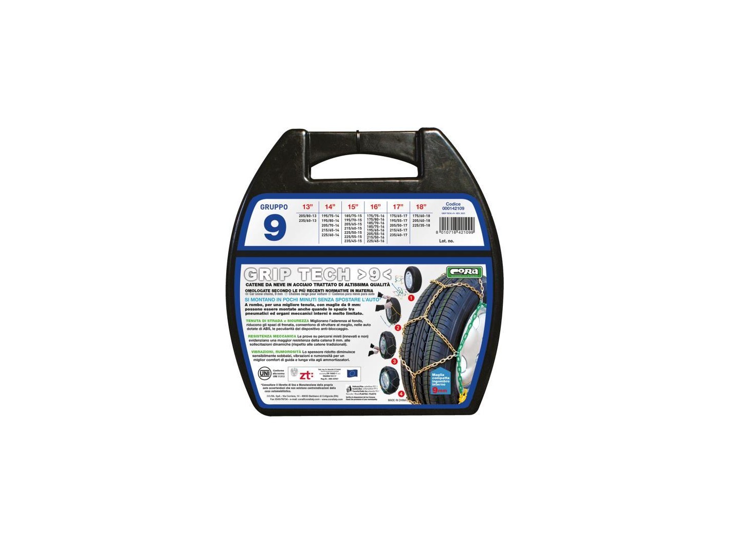 Catene da neve a rombo con maglie da 9 mm, realizzate con acciaio trattato di altissima qualità. Grazie all'ingombro ridotto, possono essere montate anche quando lo spazio tra pneumatici ed organi meccanici interni è molto limitato. Il disegno a rombo migliora l'aderenza al fondo, permettendo di ridurre gli spazi di frenata e garantendo un miglior sfruttamento del dispositivo anti-bloccaggio nelle auto dotate di ABS. Lo spessore ridotto riduce sensibilmente sobbalzi, vibrazioni e rumorosità, aum entando il comfort di guida e la durata degli ammortizzatori. Montaggio facile e veloce in meno di 3 minuti senza spostare o sollevare l'auto. In pratica valigetta salvaspazio/salvabaule. Conformi alle normative UNI 11313, CUNA NC 178-01, ONORM V5117. Adatte per le seguenti misure di pneumatico: 13'' (205/80-13, 235/60-13), 14'' (195/75-14, 195/80-14, 205/70-14, 215/65-14, 225/60-14), 15'' (185/75-15, 195/70-15, 205/65-15, 215/60-15, 225/50-15, 225/55-15, 235/45-15), 16'' (175/75-16, 175/80-16, 185/ 70-16, 185/75-16, 195/65-16, 205/55-16, 215/50-16, 225/45-16), 17'' (175/65-17, 195/55-17, 205/50-17, 215/45-17, 235/40-17), 18'' (175/60-18, 205/40-18, 225/35-18).