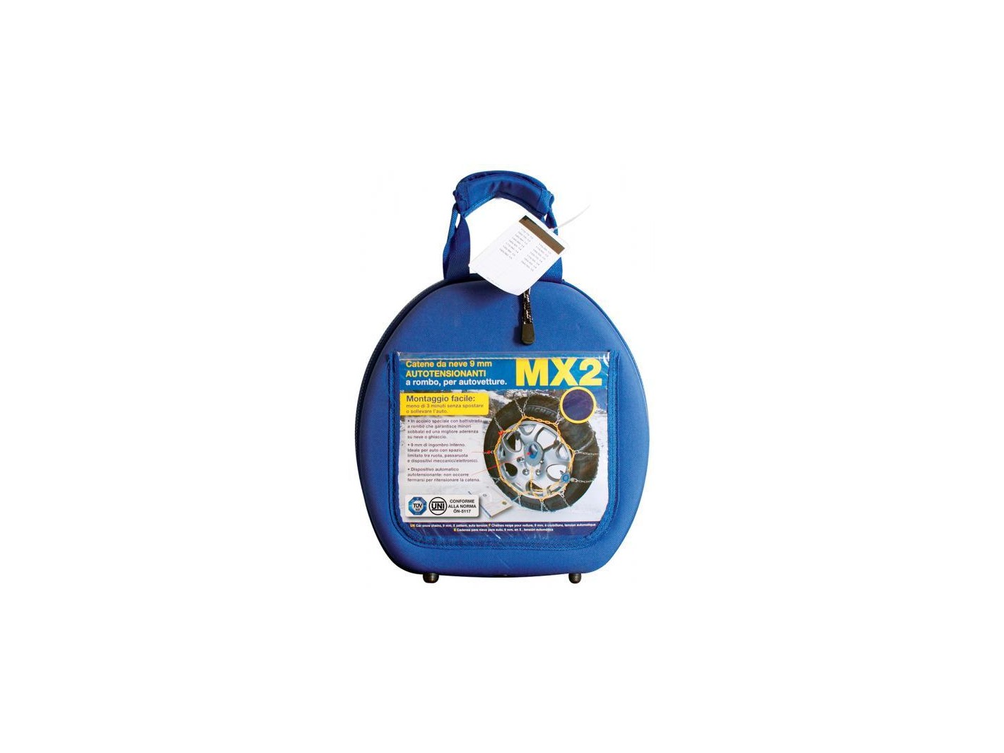 Catene da neve a rombo con maglie da 9 mm. Ideali per le auto moderne con spazio limitato tra ruota, passaruota e dispositivi meccanici/elettronici. Ultra confortevoli: il minimo spessore delle maglie riduce sensibilmente sobbalzi, vibrazioni e rumorosità prolungando la durata degli ammortizzatori e degli pneumatici. In acciaio trattato di altissima qualità, con battistrada a rombo per un miglior comfort e tenuta di strada su neve e ghiaccio. Provviste di dispositivo di tensionamento automatico: non occorre fermarsi per ritensionare la catena. Montaggio facile e veloce in meno di 3 minuti senza spostare o sollevare l'auto. In pratica valigetta salvaspazio/salvabaule. Conformi alle normative UNI 11313, CUNA NC 178-01, ONORM V5117. Adatte per le seguenti misure di pneumatico: 13'' (185/80-13, 195/70-13, 195/75-13, 205/65-13, 215/60-13, 225/55-13), 14'' (175/80-14, 185/70-14, 195/65-14, 205/60-14, 215/55-14, 225/50-14), 15'' (165/75-15, 165/80-15, 175/70-15, 185/65-15, 195/60-15, 205/50-15, 205/55-15, 215/50-15, 225/40-15), 16'' (175/60-16, 185/55-16, 185/60-16, 195/50-16, 205/45-16, 215/45-16), 17'' (175/55-17, 205/40-17).
